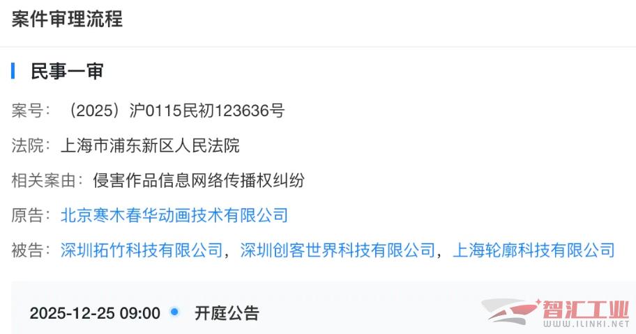此外,《羅小黑戰(zhàn)記》的版權(quán)方(著作權(quán)人)北京寒木春華動(dòng)畫技術(shù)有限公司在去年年底也曾將拓竹科技等告上法庭,案由為侵害作品信息網(wǎng)絡(luò)傳播權(quán)糾紛,該案已于2025年12月25日完成首次開庭審理。